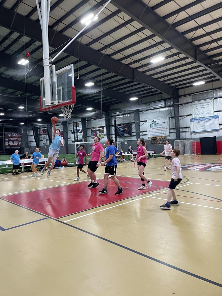Basketball is a team sport where two teams compete to score points by shooting a ball through the opposing team's hoop. Players pass, dribble, and shoot while defending their own basket. For scrimmages, our coaches divide teams in an age-appropriate manner to ensure fair and competitive play.